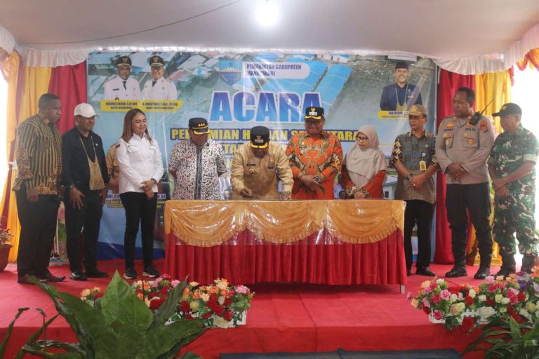 Ket. Foto : Penandatanganan berita acara peresmian Huntara oleh Bupati Manokwari Hermus Indou